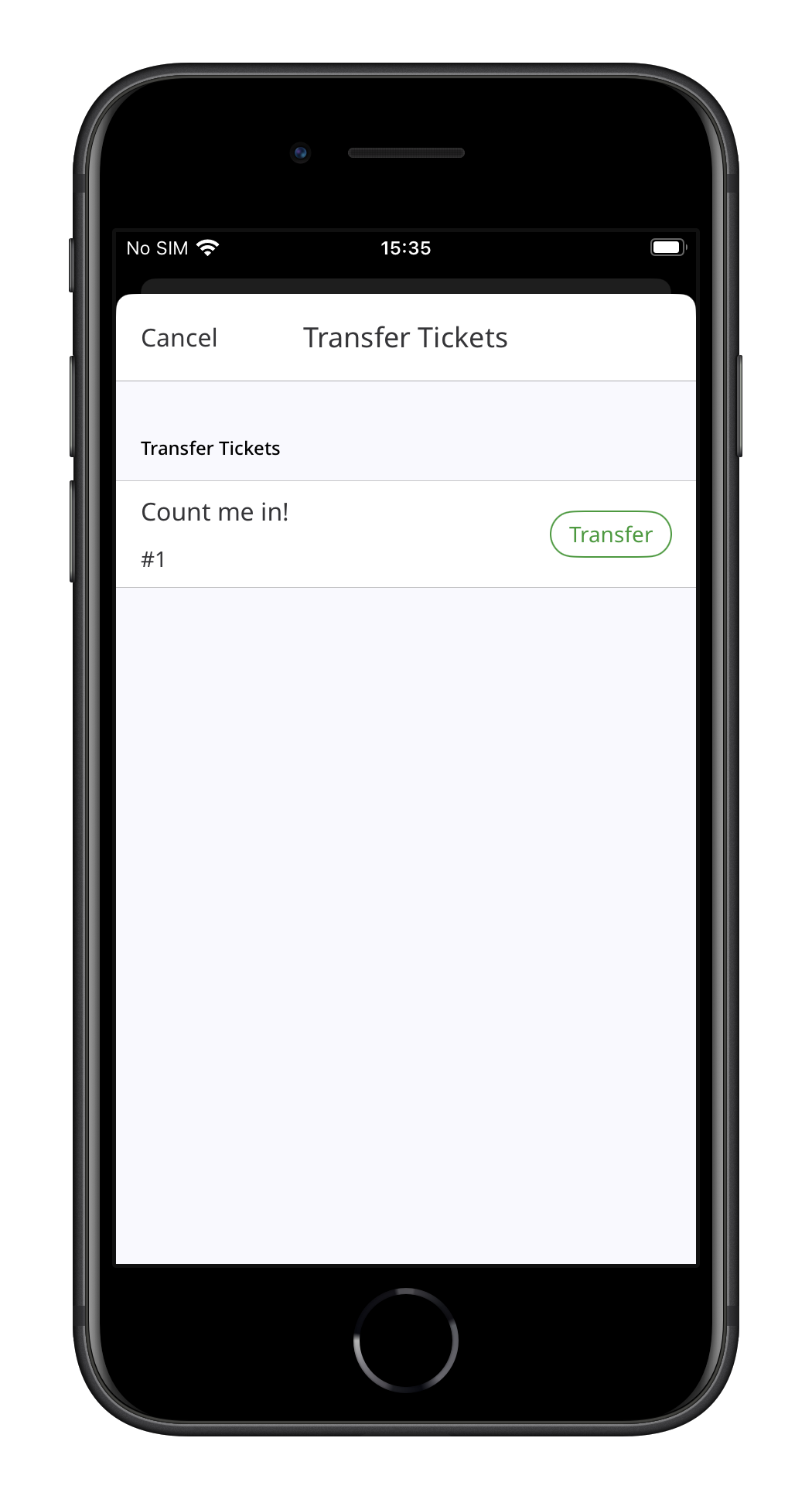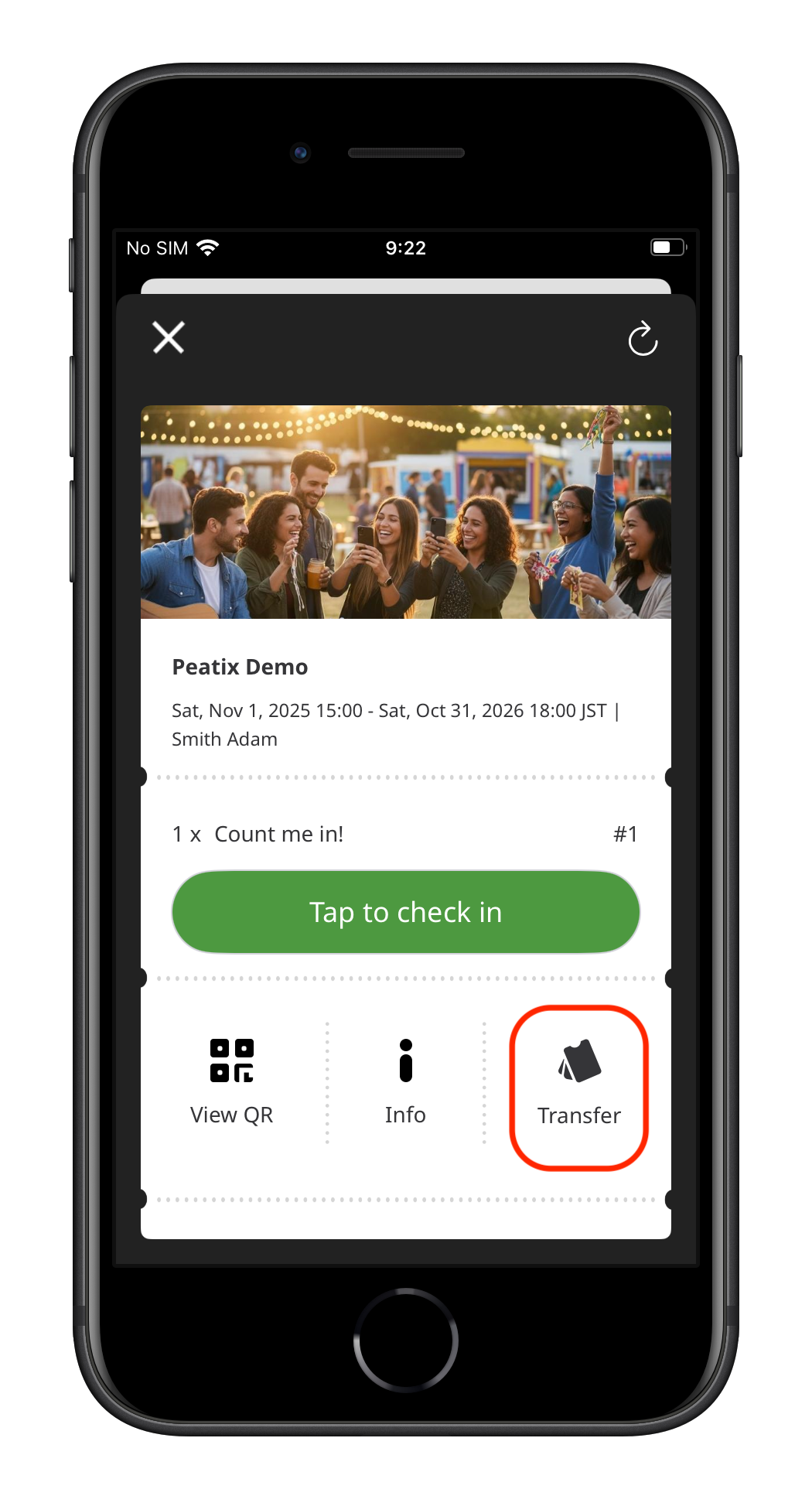 2. Click the "Transfer" button. If you purchased multiple tickets, you can transfer tickets 1 by 1, starting from the highest ticket number.