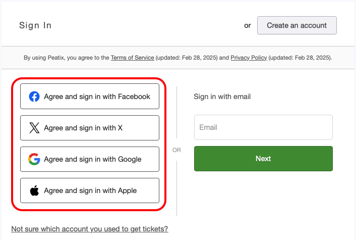 *If you have not set a password, the password input field will not appear. When you click "Email me a sign in code", a sign in code will be sent to your Peatix-registered email address.