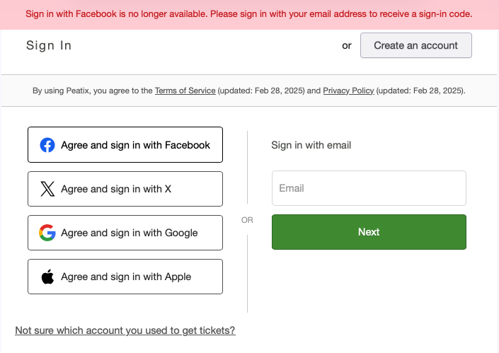 - I encountered “Sign in with Facebook is no longer available. Please sign in with your email address to receive a sign-in code.” message
