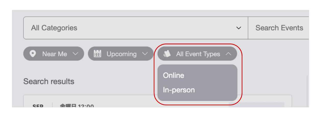 The "In-person" option has been added to the event search filter on web browsers. By selecting the search options, you can filter events by 'In-person' or 'Online'.