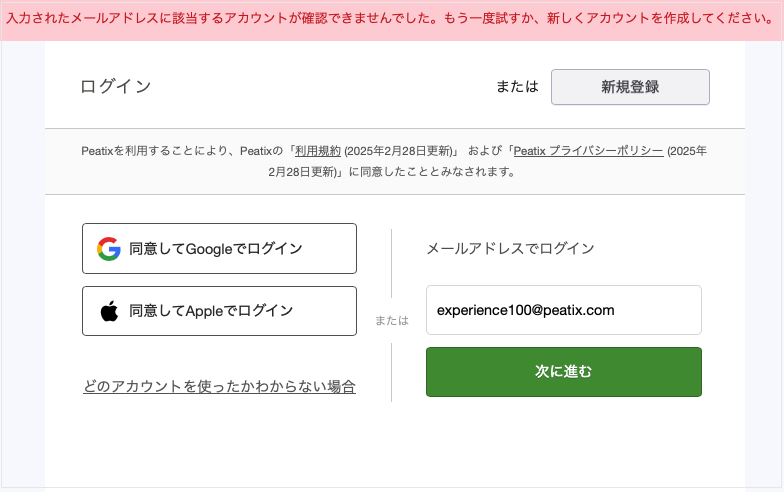 入力したメールアドレスとは別のメールアドレスや外部サービスアカウント(Google, Apple)が、ピーティックスに登録されています。