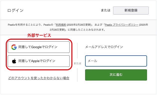 すでにピーティックスアカウントと連携している他の外部サービス名が表示されるので、「(外部サービス名)でログイン」ボタンをクリックしてください。