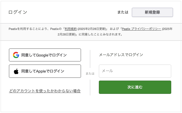 ※ピーティックスアプリを利用の場合は、「メール使う」を選択後、メールアドレスを入力したら「認証」をタップしてください。
