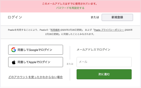 使用したいメールアドレスでアカウントの新規登録をする際、「このメールアドレスはすでに使用されています」と表示された場合、入力されたメールアドレスはすでに別のピーティックスアカウントに登録されています。